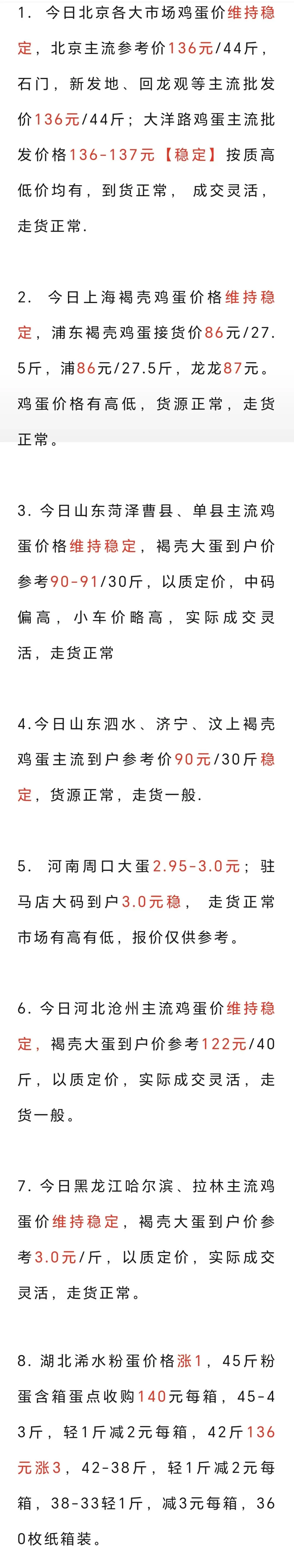 二0二六年元月5日各地鸡蛋价格 养羊网 2026-01-05 二0二六年元月5日各地鸡蛋价格 养羊网 2026-01-05 上一篇:10月28日成都鸡蛋价格参考 下一篇:01月05日宜春褐壳鸡蛋价格 您可能还会对下面的文章感兴趣111: 相关文章 适合回乡镇做的六个小生意 近期价格更新!!! 2025年4月13日全国各地生猪价格信息 2025年4月13日全国各地生猪价格信息