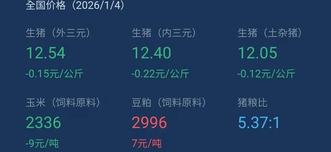 一、今天(2026年1月4日)全国生猪标准体重平均价格12.4-13.0元/公斤,同比昨日(2026年1月3日)价格下跌0.1元/公斤。