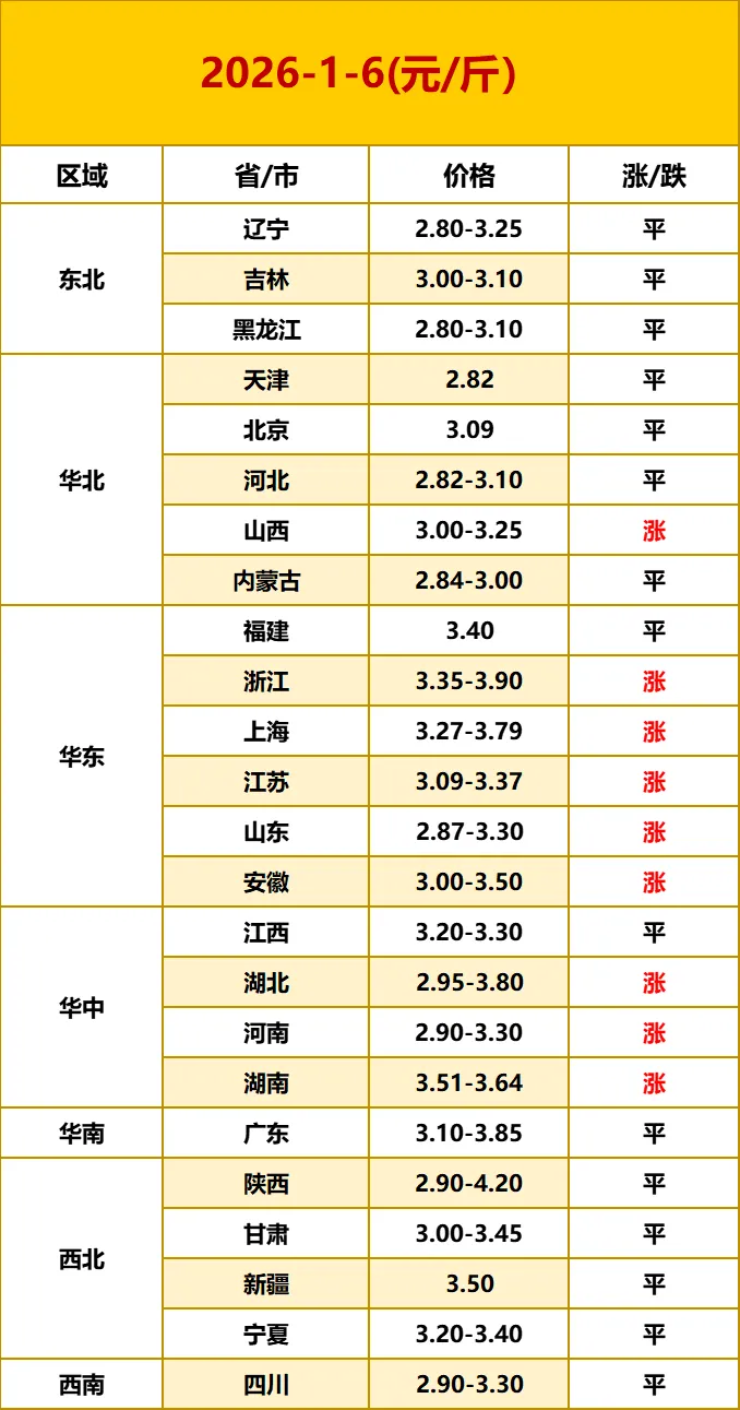 【鸡蛋价格】2026.1.6—最新鸡蛋价格 养羊网 2026-01-06 【鸡蛋价格】2026.1.6—最新鸡蛋价格点击蓝字关注我们吧~ 已关注 关注 重播 分享 赞 视频详情 鸡蛋价格早知道网络报价有高低,仅供参考,不作为你的买卖依据!!! 已关注 关注 重播 分享 赞 视频详情 养羊网 2026-01-06 上一篇:2026年1月6日鸡蛋价格 下一篇:猪价行情(2026.1.6)︱仅供参考 您可能还会对下面的文章感兴趣111: 相关文章 那些卖2块钱的鹅蛋是真的吗? 政策,促进生猪市场平稳运行,股票一览 近期价格更新!!! 内娱应援顶级审美,羊圈有一票
