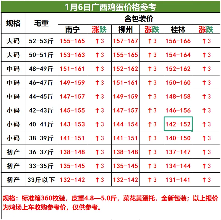 1月6日桂林、柳州、南宁鸡蛋价格参考,价格涨