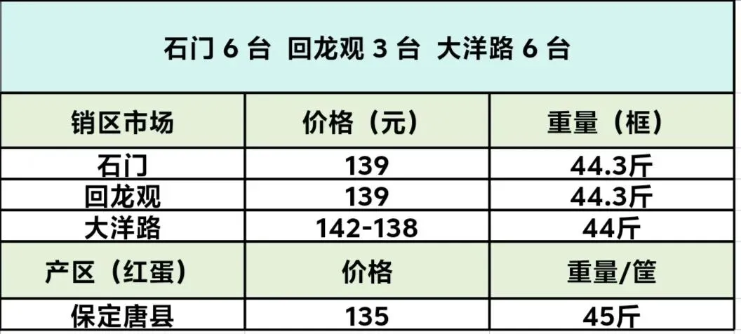 大洋路鸡蛋价格2026年 1 月 6 日报价 养羊网 2026-01-06 大洋路鸡蛋价格2026年 1 月 6 日报价大洋路到 6 台,价格 142-138 元,货快,没有剩车,明天回车预计 2-3 台附近。 养羊网 2026-01-06 上一篇:【涨!】2026年1月6日鸡蛋价格行情,仅供参考 下一篇:2026年1月6日全国部分地区鸡蛋价格 您可能还会对下面的文章感兴趣111: 相关文章 近期价格更新!!! 近期价格更新!!! 鸡蛋报价【3月17日】 2025年4月13日全国各地生猪价格信息