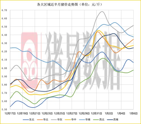 西北、华北、华中、华东、西南地区猪价呈现上涨,东北、华南地区猪价呈现下跌,生猪平均价格微涨。