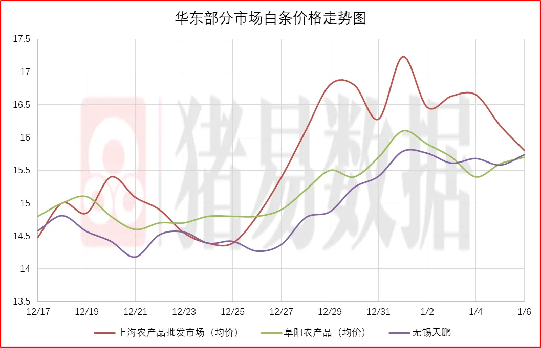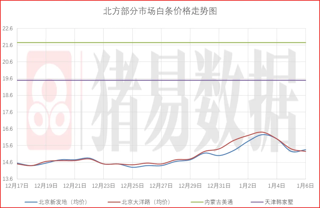 从今日北京、上海消费城市批发市场白条价格走势来看,北京、上海批发市场白条开磅价格呈现跌涨调整,北京大部分市场开磅价格维持稳定,部分市场开磅价格下跌0.3元/公斤,市场走货速度表现一般偏差;上海市场价格呈现下跌,部分市场成交价参考15.7-15.8元/公斤,到货量表现有所减少,市场交易情绪表现偏差,市场成交均价表现偏差。