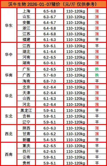 ? ?猪价播报沃小牛,助力养猪牛牛牛!各位养猪的老铁们,大家好!我是沃小牛,明天是2026年01月07日,最新猪价已经出来了:明天全国猪价涨面进一步扩大,北部和东部涨面较大。走势显露出矛盾与希望并存的信号:一方面,元旦节后市场呈现典型的“北涨南跌”区域分化,全国均价在12.42元/公斤的偏低水平稳中微涨;另一方面,从地方到行业展望,“稳步扩大”的涨面预期正在形成。这并非简单的短期反弹,而是供需格局在政策引导、产能调整和季节因素等多重力量博弈下的新平衡。随着“稳产能、降成本、强科技”成为行业贯穿全年的发展主线,2026年的猪市或将彻底告别过去的暴涨暴跌,步入一个由超级专业化企业主导、价格温和修复、盈利模式深刻变革的全新阶段。