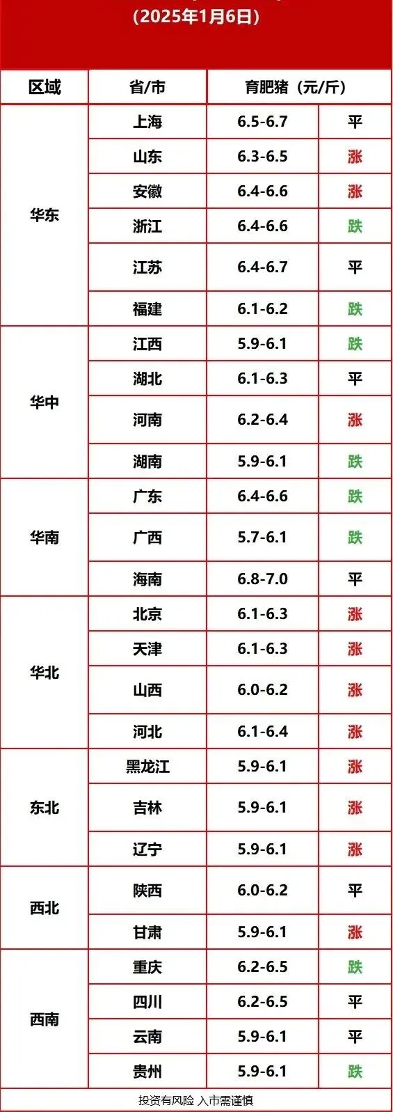 1月6日猪价南跌北涨明显 生猪价格预估回暖 养羊网 2026-01-06 1月6日猪价南跌北涨明显 生猪价格预估回暖每日猪价行情1月6日猪价南跌北涨明显生猪价格预估回暖 已关注 关注 重播 分享 赞 视频详情 www.chinabreed.com中国养殖网 养羊网 2026-01-06 上一篇:2026年1月6日鸡蛋价格上涨 下一篇:狼哥明日(1.7)鸡蛋价格预测,文末有豆粕下午报价 您可能还会对下面的文章感兴趣111: 相关文章 一句话 奶香 没膻味 清水20分左右 香嫩 2025年4月13日全国各地生猪价格信息 近期价格更新!!! 近期价格更新!!!
