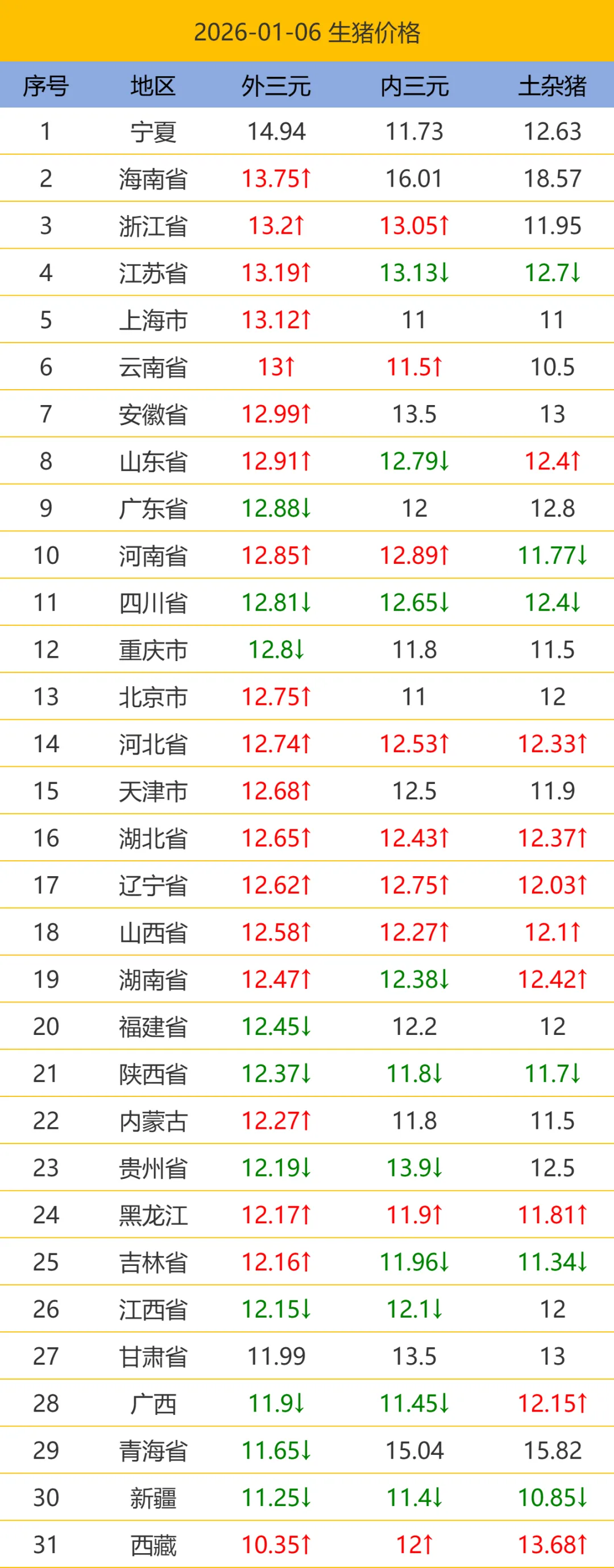 今日猪价.2026.01.06最新生猪价格/期货猪价 养羊网 2026-01-06 今日猪价.2026.01.06最新生猪价格/期货猪价以下猪价为平均价格(单位:元/公斤),仅供参考。 养羊网 2026-01-06 上一篇:2026.1.7,鸡蛋价格快讯 下一篇:【涨】2026年1月6日(早间)鸡蛋价格行情参考 您可能还会对下面的文章感兴趣111: 相关文章 高新区石羊场套二3??0??0??0??实图实价 【明日猪价】5月15日全国猪价稳定为主! 2025年4月13日全国各地生猪价格信息 2025年4月13日全国各地生猪价格信息
