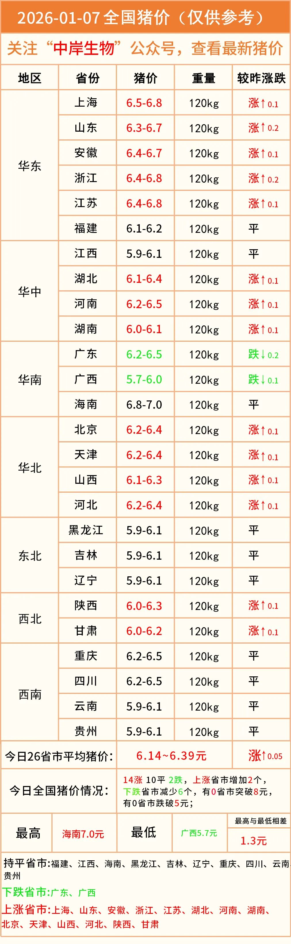 明日猪价|2026-01-07全国最新猪价(猪价已更新!) 养羊网 2026-01-07 明日猪价|2026-01-07全国最新猪价(猪价已更新!)营销中心丨0731-83806009技术服务丨0731-83806019 养羊网 2026-01-07 上一篇:每日猪价 2025年10月20日 下一篇:【明天猪价】2026.01.07全国猪价(涨涨涨,猪价继续小幅上涨!) 您可能还会对下面的文章感兴趣111: 相关文章 老屋改造——开始做橱柜+衣橱 第39篇:什么是【猪周期】? 2025年4月13日全国各地生猪价格信息 我的十一敦煌游