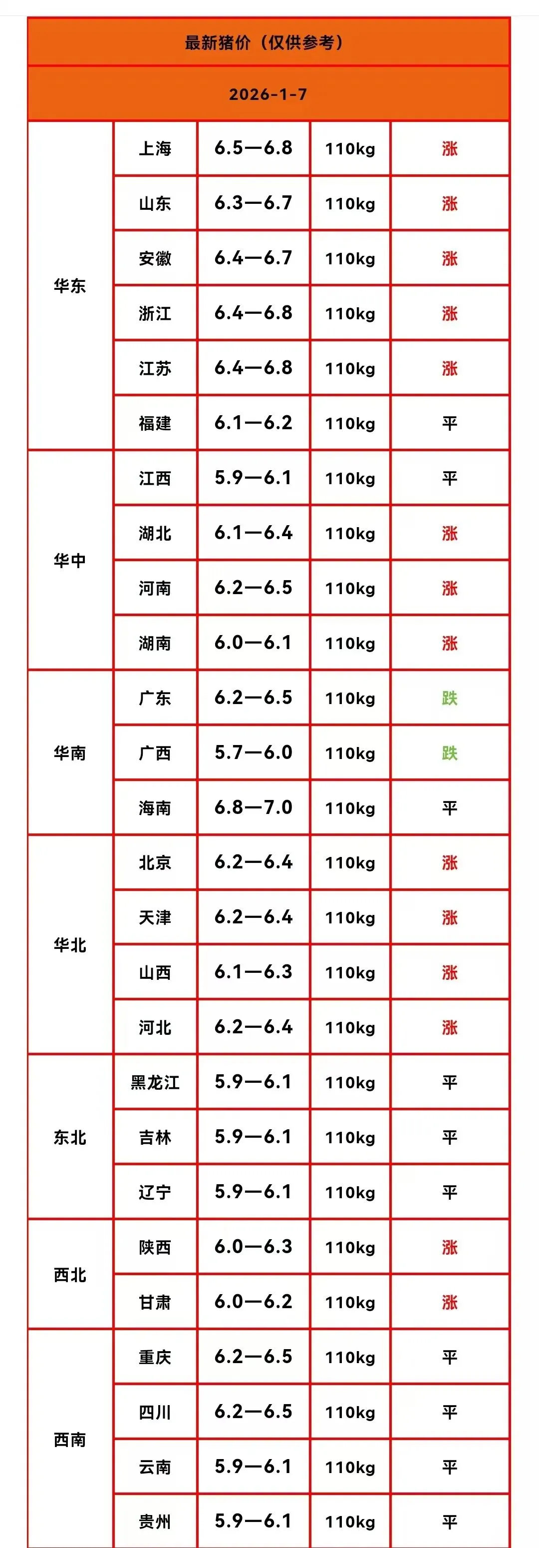 - 下跌地区:仅新疆、内蒙古微跌0.05元/公斤;