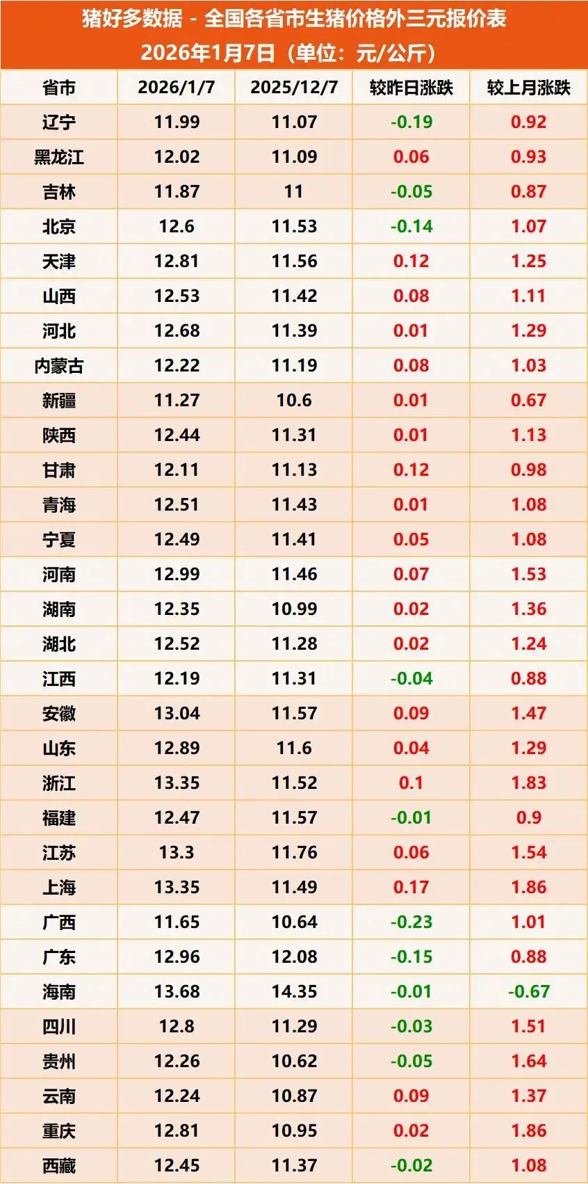 步步高升!生猪价格延续昨日涨势,猪价行情重心持续上移!据猪好多数据监测显示,2026年1月7日全国外三元生猪均价为12.52元/公斤,较昨日上涨0.03元/公斤。当前生猪市场呈现明显回暖态势,国家发改委最新数据也带来积极信号,生猪养殖头均亏损缩减至212.26元,较前一周减亏48.69元每头。