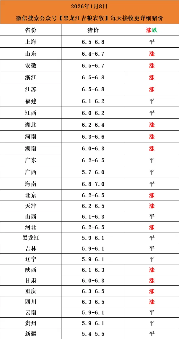 【黑龙江吉粮农牧】2026年1月8日猪价早知道点击上方"蓝字" 关注我们吧!