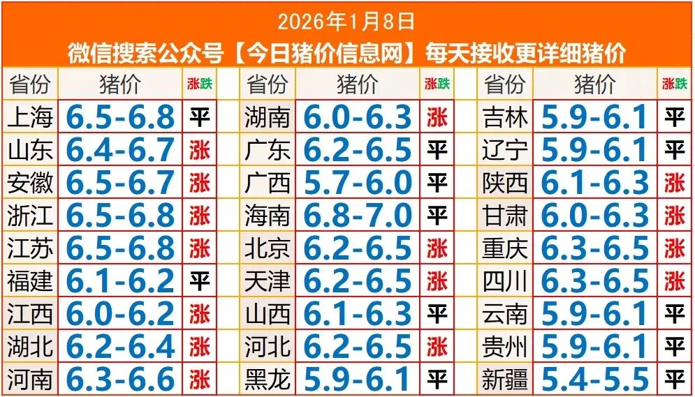 【问猪病加我】2026.1.8-明日猪价.继续上涨,一片红!!(好猪价.养好猪!)点击上面