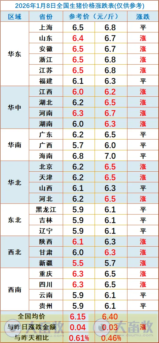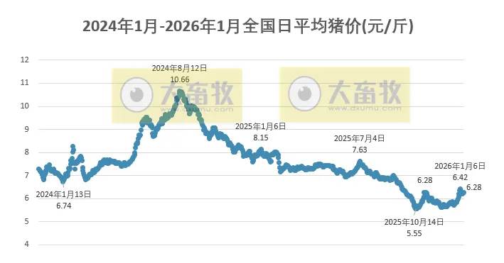 大畜牧根据27省的猪价数据,计算出2026年1月8日全国平均猪价为每斤6.28元,比昨天上涨0.04元,涨幅为0.54%,连续2天上涨,累计上涨0.07元,为近5天最高价。