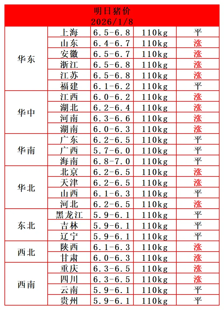 2026.1.8-今日最新猪价(步步高升,猪价继续飘红!) 养羊网 2026-01-08 2026.1.8-今日最新猪价(步步高升,猪价继续飘红!) 养羊网 2026-01-08 上一篇:【一箱蛋】1.7-全国鸡蛋价格与供求信息!(大部上涨!) 下一篇:【1月8日】毛鸡、种蛋、鸡蛋价格预报 您可能还会对下面的文章感兴趣111: 相关文章 花小猪太坑了,以后都不想在这打车 临沂人自己的可生食鸡蛋? 9月25日全国早间猪价低位震荡! 好想念十几块钱的猪肉啊……