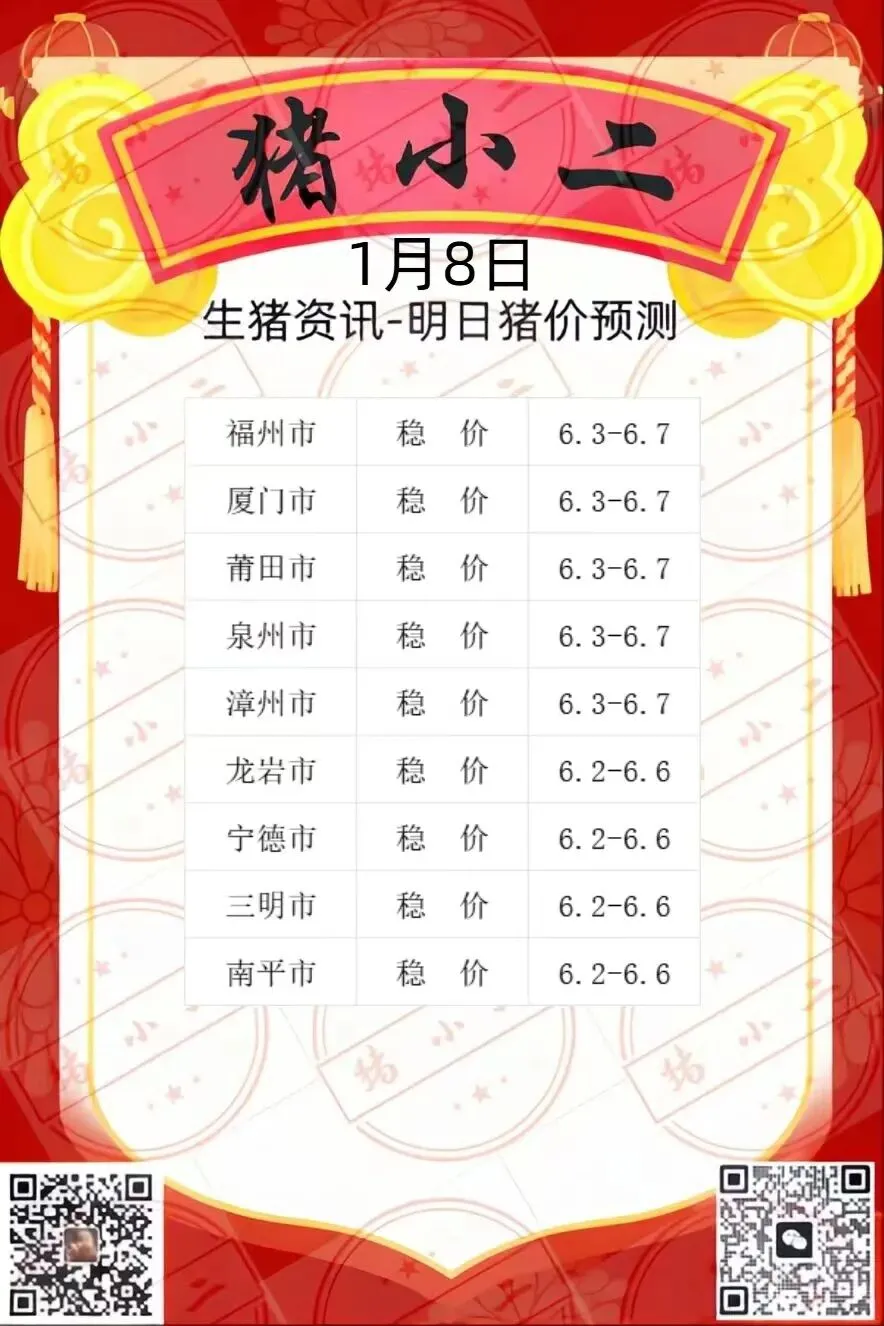【猪小二】1.8日福建猪价预测:稳定为主 养羊网 2026-01-08 【猪小二】1.8日福建猪价预测:稳定为主 养羊网 2026-01-08 上一篇:20260108国内生猪市场报价:猪价“北强南弱”微涨,猪肉购销积极性转强,叠加部分家庭制作香肠,带动需求改善! 下一篇:2026.1.07鸡蛋价格 您可能还会对下面的文章感兴趣111: 相关文章 近期价格更新!!! 2025年4月13日全国各地生猪价格信息 近期价格更新!!! 近期价格更新!!!