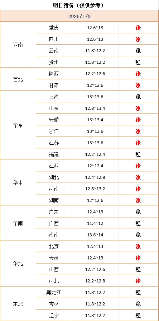 聚焦 | 猪价早知道 养羊网 2026-01-08 聚焦 | 猪价早知道猪价查询以下数据仅供参考???更多购销业务,欢迎致电详聊!↓↓↓关注“德康种猪”,获取更多资讯! 养羊网 2026-01-08 上一篇:2026年1月8日西安鸡蛋价格参考 下一篇:猪市走向:您那猪价涨了吗?猪价区域分化加剧 北涨南跌态势延续! 您可能还会对下面的文章感兴趣111: 相关文章 佩奇佩奇 2025年4月13日全国各地生猪价格信息 我在北大吃什么之学五早餐馄饨 疯了吧拍立得相纸这个价格