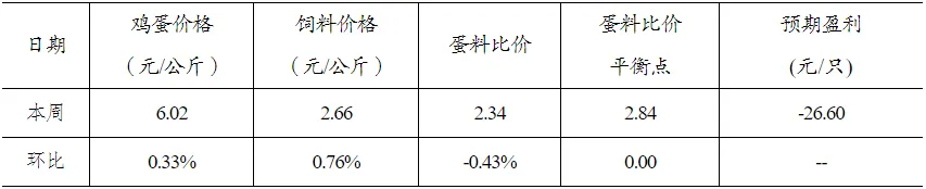 本周全国蛋料比价为2.34,环比下跌0.43%。按目前价格及成本推算,未来蛋鸡养殖每只亏损26.60元。 受元旦节前备货拉动,产区内销走货普遍好转,价格小幅上涨,但随着下游备货结束,各环节积极出货,蛋价止涨走稳。 元旦过后,贸易商陆续开始补货,加之食品厂采购量增加,市场需求转好有望拉动鸡蛋价格上涨,但鸡蛋供应充足,或压制蛋价上涨幅度,预计下周鸡蛋价格小幅上涨。