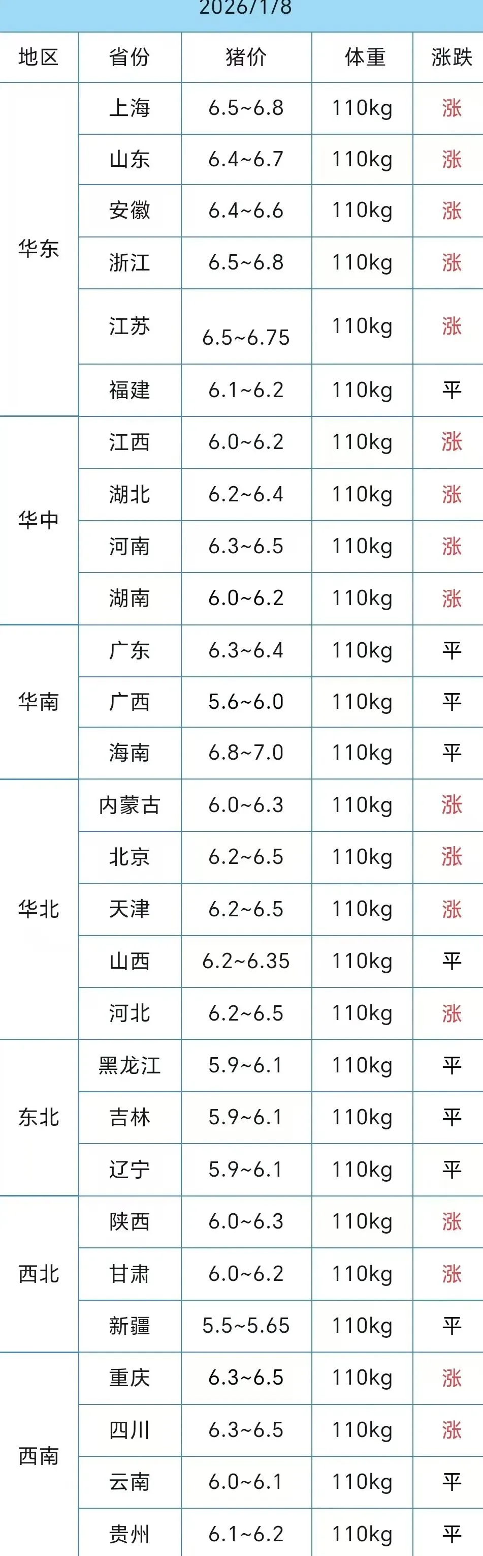 2026-01-08今日猪价 养羊网 2026-01-08 2026-01-08今日猪价 养羊网 2026-01-08 上一篇:1月9日全国猪价 下一篇:2026.1.8鸡蛋价格 您可能还会对下面的文章感兴趣111: 相关文章 近期价格更新!!! 近期价格更新!!! 11月26日馆陶鸡蛋价格 2025年4月13日全国各地生猪价格信息