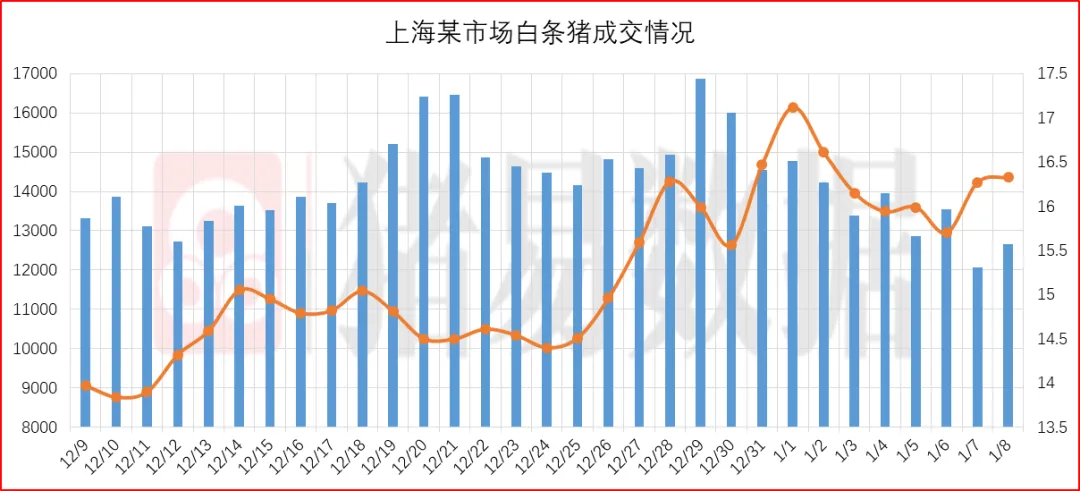 从今日北京、上海消费城市批发市场白条价格走势来看,北京、上海批发市场白条开磅价格呈现跌涨调整,北京大部分市场开磅价格维持稳定,部分市场开磅价格上涨0.3元/公斤,市场走货速度表现一般;上海市场价格呈现上涨,部分市场成交价参考16.28-16.33元/公斤,到货量表现有所增加,市场交易情绪表现有所下滑,市场成交均价表现一般。