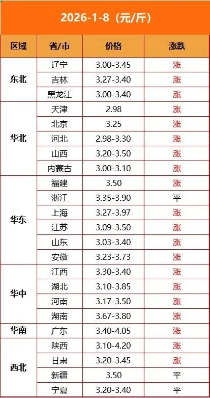 2026年1月8日全国鸡蛋价格行情:整体稳中上涨,局地小幅上调