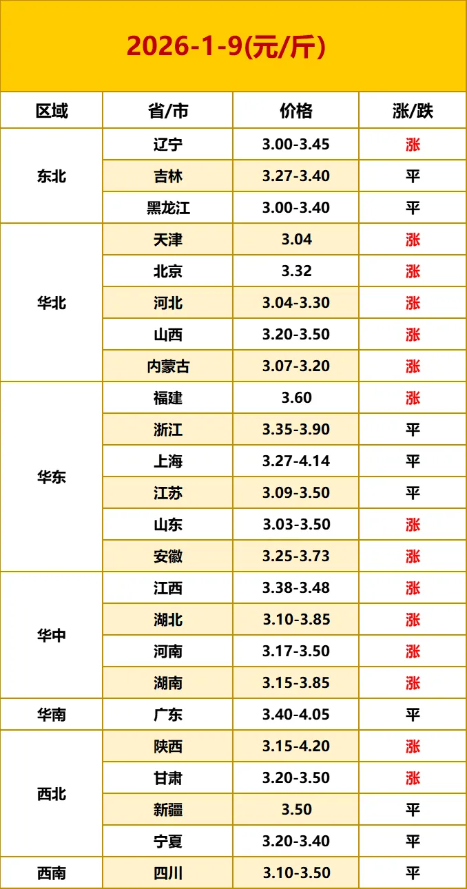【鸡蛋价格】2026.1.9—最新鸡蛋价格 养羊网 2026-01-08 【鸡蛋价格】2026.1.9—最新鸡蛋价格点击蓝字关注我们吧~ 已关注 关注 重播 分享 赞 视频详情 鸡蛋价格早知道网络报价有高低,仅供参考,不作为你的买卖依据!!! 已关注 关注 重播 分享 赞 视频详情 养羊网 2026-01-08 上一篇:猪价大预测】1月10日~1月13日!全国猪价! 下一篇:【一箱蛋】1.8-全国鸡蛋价格与供求信息!(有稳有涨!) 您可能还会对下面的文章感兴趣111: 相关文章 我家做饭阿姨是不是隐形富豪 鲜切吊龙19.9一斤??还等什么,快冲?? 2025年4月13日全国各地生猪价格信息 来卖羊啦~