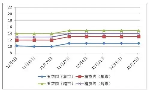 五花肉(集贸市场)平均价格为11.00元/斤,月环比上涨6.7%,同期比下降12%。精瘦肉(集贸市场)平均价格为13.00元/斤,月环比上涨6.1%,同期比下降13.3%。五花肉(超市)平均价格为14.90元/斤,月环比上涨5.3%,同期比下降23.0%。精瘦肉(超市)平均价格为13.90元/斤,月环比上涨5.7%,同期比下降17.3%。受冬至腌腊需求提振,以及元旦备货、天气转冷等因素影响,12月份猪肉价格小幅上涨。