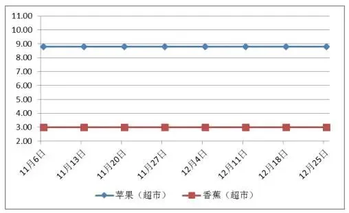 超市,苹果(红富士)平均价格为8.80元/斤,月环比持平,同期比持平;香蕉平均价格为2.99元/斤,月环比持平,同期比下降8.8%。