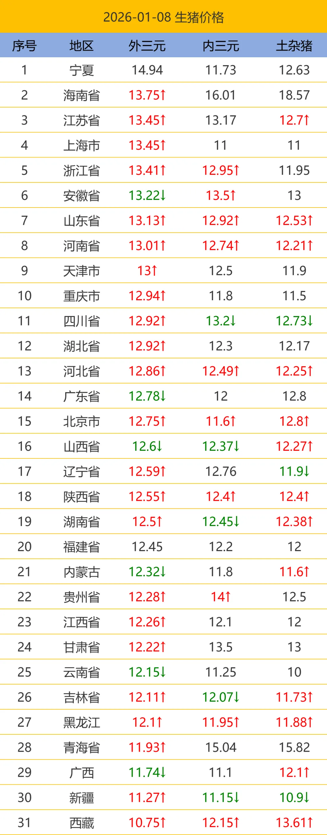 今日猪价.2026.01.08最新生猪价格/期货猪价 养羊网 2026-01-09 今日猪价.2026.01.08最新生猪价格/期货猪价以下猪价为平均价格(单位:元/公斤),仅供参考。 养羊网 2026-01-09 上一篇:北方领涨!18省猪价飘红!2026年猪市拐点已定!专家警告:下半年涨价前提是扛过这场“淘汰赛” 下一篇:猪价僵持中探涨,节前还能冲多高? 您可能还会对下面的文章感兴趣111: 相关文章 2025年4月13日全国各地生猪价格信息 帮家里卖羊的第11天,这也太不容易了 2025年4月13日全国各地生猪价格信息 鸡蛋是不是明天再涨可以短多一下了