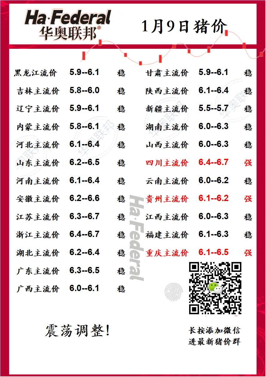 1月9最新猪价 走稳 养羊网 2026-01-09 1月9最新猪价 走稳进最新报价群 加微信 v联系电话:137 ?0084 ?5054 养羊网 2026-01-09 上一篇:价大预测】1月9日~1月11日!全国猪价! 下一篇:明日猪价——2026年01月09日全国生猪价格! 您可能还会对下面的文章感兴趣111: 相关文章 鸡蛋期货短期:底部支撑形成,上行待突破 近期价格更新!!! 一张图了解三大猪企 原生态土鸡蛋