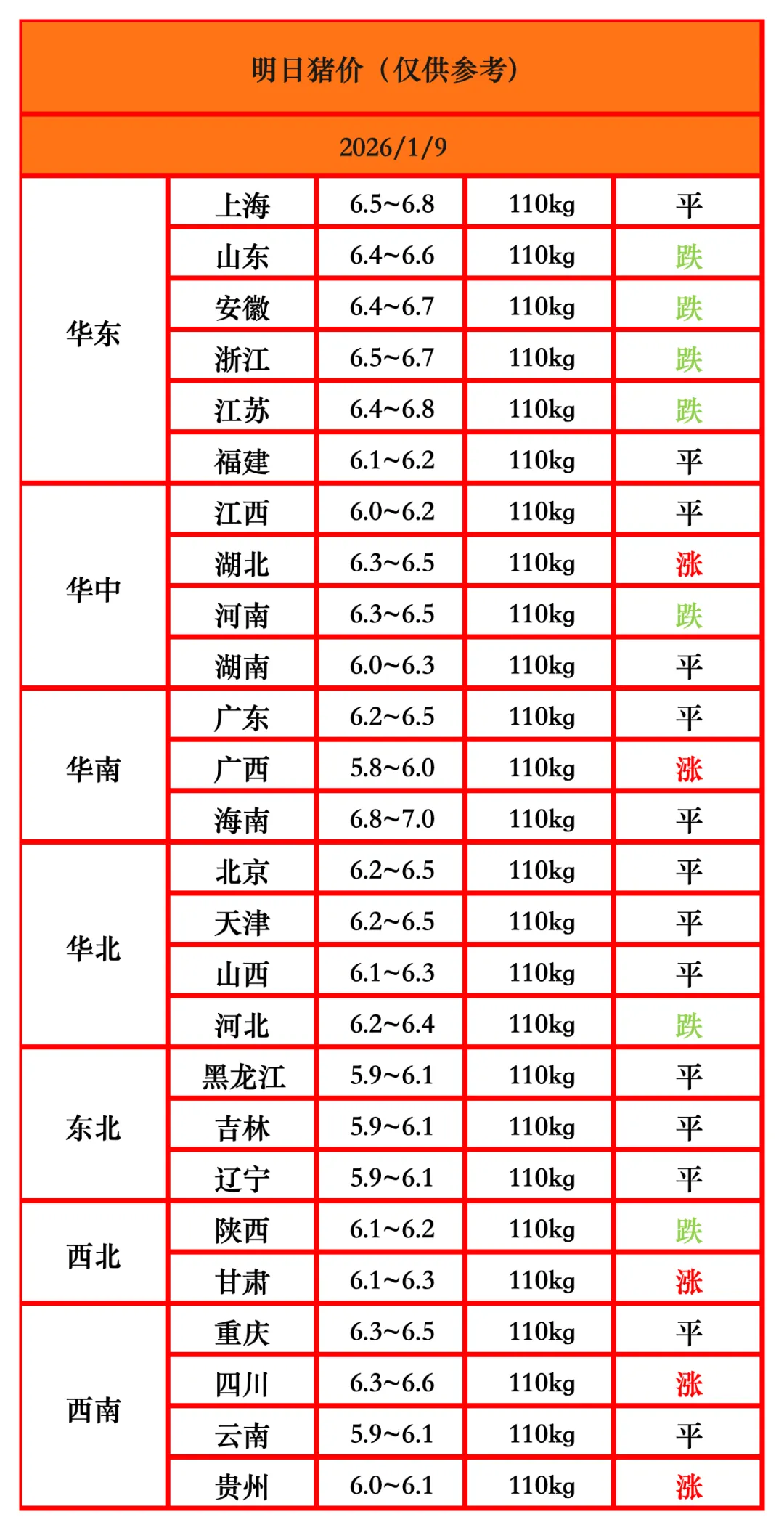 1、整体来看,全国生猪价格呈现跌涨调整态势。集团猪场生猪成交价格呈现跌涨调整态势,华南、西南地区集团猪场猪价呈现稳中伴涨态势,华东地区集团猪场猪价呈现稳中伴跌态势,东北、西北、华北、华中地区集团猪场猪价呈现跌涨调整态势。华东、华中地区龙头集团110-125公斤生猪价格下跌0.1-0.15元/公斤,125-140公斤生猪价格下跌0.05-0.25元/公斤,龙头集团猪价呈现跌涨调整态势。从养殖集团生猪上市量来看,华中地区集团生猪上市量有所减少,华东、西北地区集团生猪上市量有所增加。