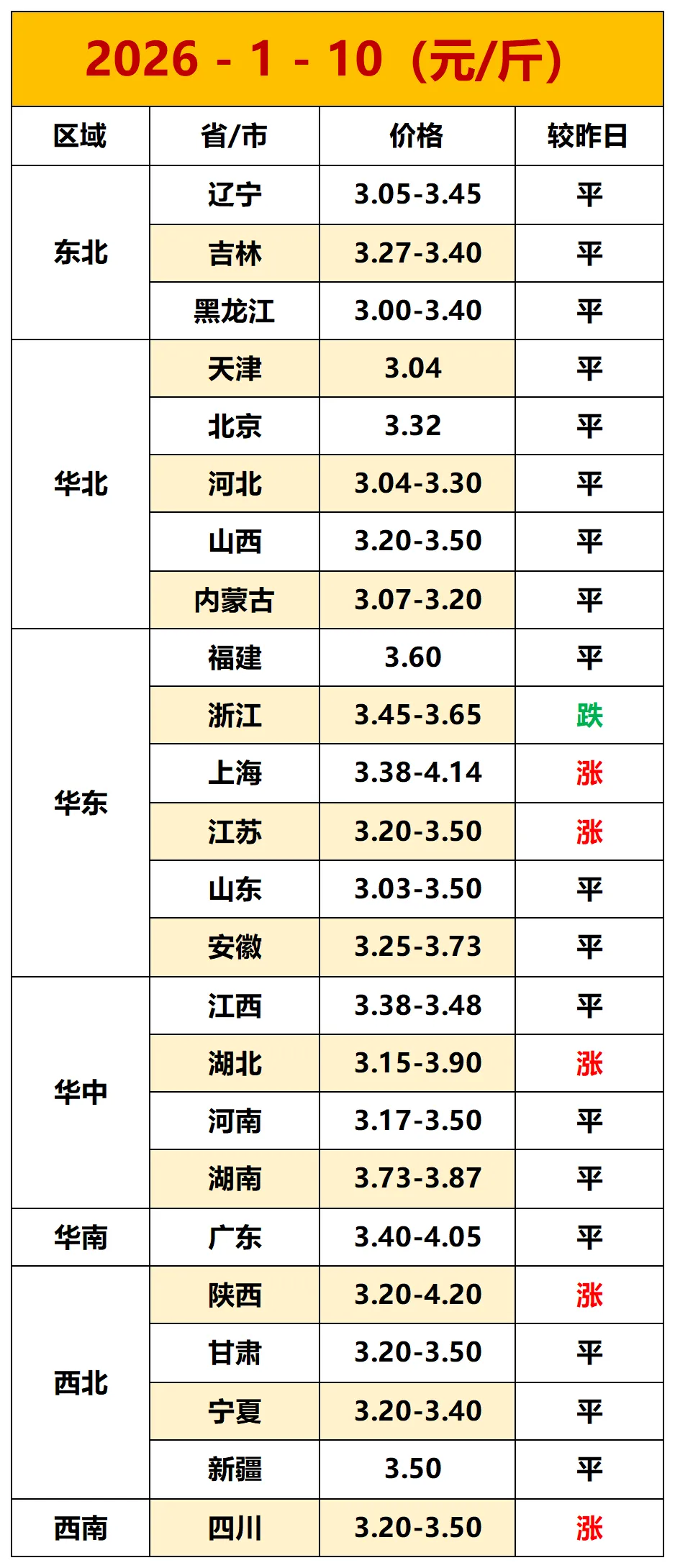 【鸡蛋价格】2026.1.10—最新鸡蛋价格 养羊网 2026-01-09 【鸡蛋价格】2026.1.10—最新鸡蛋价格点击蓝字关注我们吧~ 已关注 关注 重播 分享 赞 视频详情 鸡蛋价格早知道网络报价有高低,仅供参考,不作为你的买卖依据!!! 已关注 关注 重播 分享 赞 视频详情 养羊网 2026-01-09 上一篇:猪价四连涨背后的市场博弈:区域分化加剧仔猪回暖成行业新变量 下一篇:明天猪价行情2026.1.10 您可能还会对下面的文章感兴趣111: 相关文章 2025年4月13日全国各地生猪价格信息 效果图|草原马场 2025年4月13日全国各地生猪价格信息 猪价“起飞”!30斤仔猪破370元,补栏时机到了?看懂这几点再出手