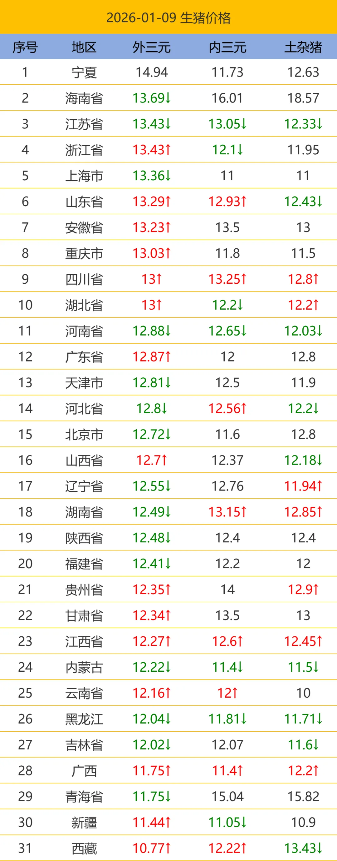 今日猪价.2026.01.09最新生猪价格/期货猪价 养羊网 2026-01-09 今日猪价.2026.01.09最新生猪价格/期货猪价以下猪价为平均价格(单位:元/公斤),仅供参考。 养羊网 2026-01-09 上一篇:【猪价预测】1月11-1月14 猪价预测 下一篇:2026年1月9日(早间)鸡蛋价格行情参考 您可能还会对下面的文章感兴趣111: 相关文章 2025年4月13日全国各地生猪价格信息 为什么“壹萬圓”能这么贵啊? 2025年4月13日全国各地生猪价格信息 鸡蛋厂源头嘉祥鸡蛋价格