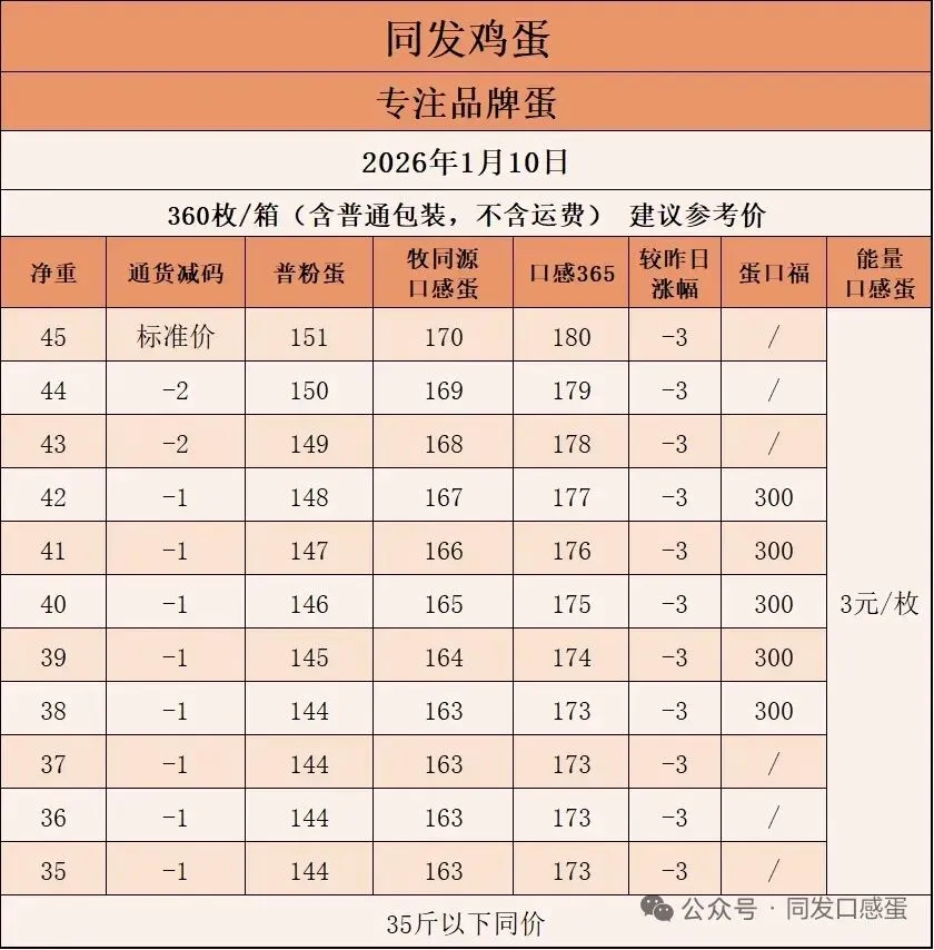 2026年1月10日贵港同发鸡蛋价格 养羊网 2026-01-10 2026年1月10日贵港同发鸡蛋价格以上价格为贵港同发鸡蛋平台公示的鸡蛋含包装成交结算价(上车价),仅供本平台渠道对接合作伙伴参考使用,不与其他任何报价做比较。 养羊网 2026-01-10 上一篇:2026年1月10日全国各地鸡蛋价格行情 下一篇:1月10日鸡蛋价格早报参考 您可能还会对下面的文章感兴趣111: 相关文章 2025年4月13日全国各地生猪价格信息 近期价格更新!!! 求租养猪场 好女人又开始哄抬猪价了