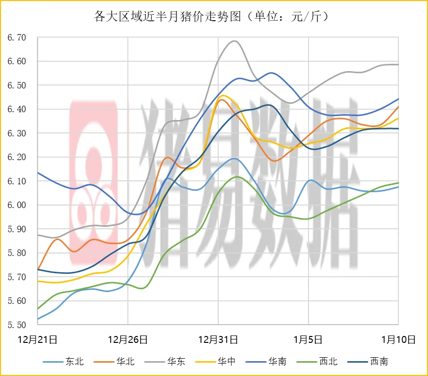 华南、西北、东北、华北、华东、华中地区猪价呈现上涨,西南地区猪价呈现稳定,生猪平均价格呈现微涨。