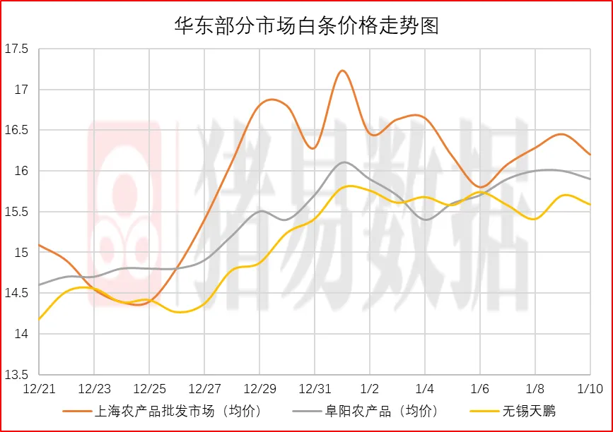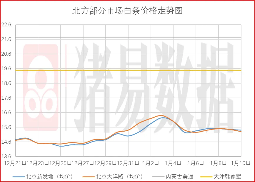 从今日北京、上海消费城市批发市场白条价格走势来看,北京、上海批发市场白条成交价格呈现跌涨调整,北京市场开磅价呈现稳定为主,市场成交均价表现一般,市场走货速度表现一般;上海市场价格呈现跌涨调整,部分市场成交价参考16.2-16.6元/公斤,到货量增加,市场交易情绪表现一般,市场成交均价表现一般。