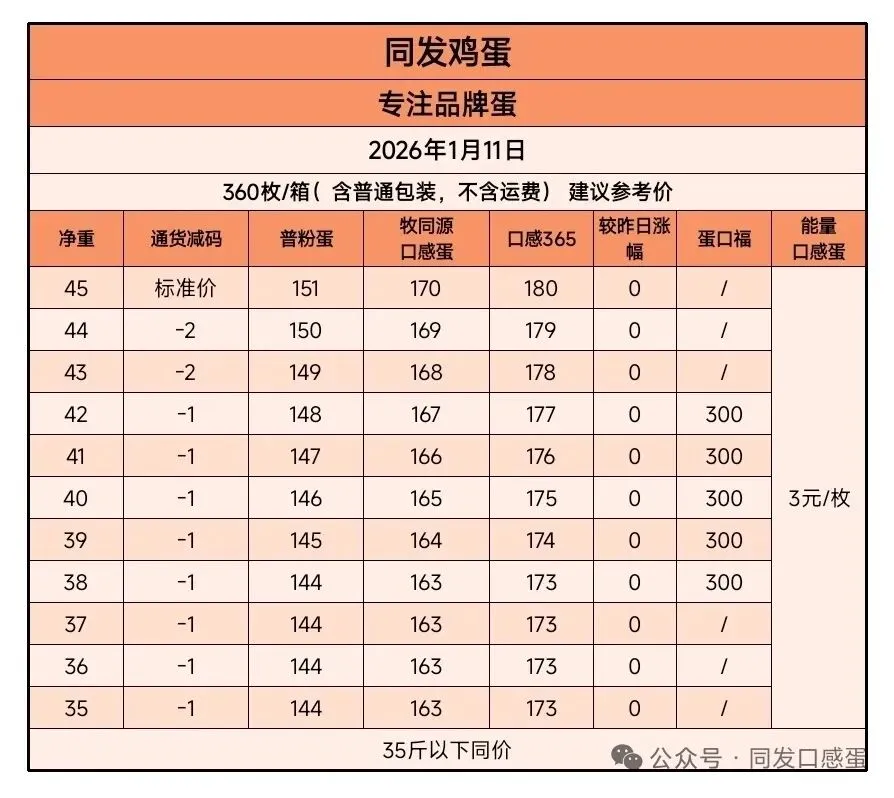 2026年1月11日贵港同发鸡蛋价格 养羊网 2026-01-11 2026年1月11日贵港同发鸡蛋价格以上价格为贵港同发鸡蛋平台公示的鸡蛋含包装成交结算价(上车价),仅供本平台渠道对接合作伙伴参考使用,不与其他任何报价做比较。 养羊网 2026-01-11 上一篇:多红!2026.1.12毛猪价! 下一篇:【拉猪啦】1.12-猪价行情与买卖猪信息!(有涨有跌!屠宰采购难度一般!) 您可能还会对下面的文章感兴趣111: 相关文章 2025年4月13日全国各地生猪价格信息 这个羊好一些了 食品工厂设计 近期价格更新!!!