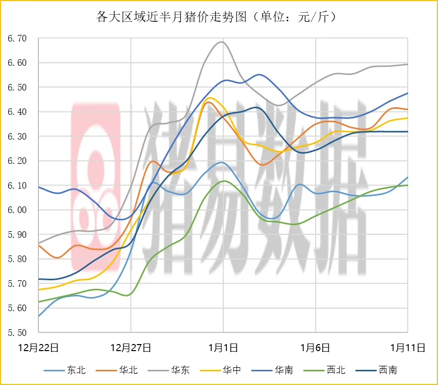 华南、西北、东北、华东、华中地区猪价呈现上涨,华北、西南地区猪价呈现稳定,生猪平均价格呈现微涨。