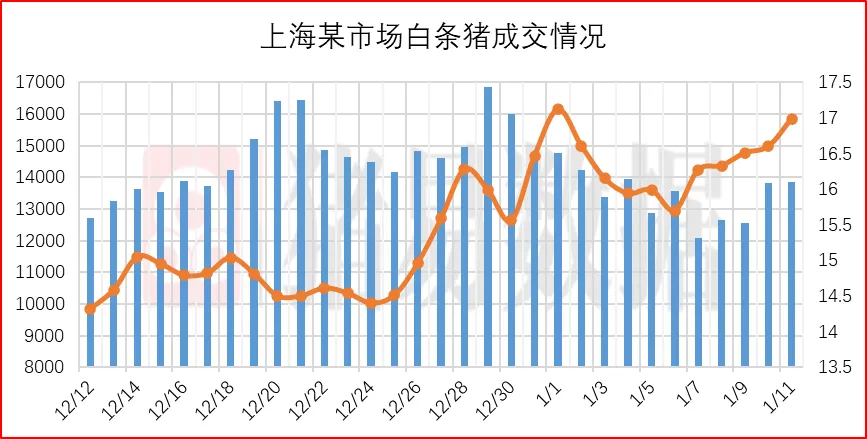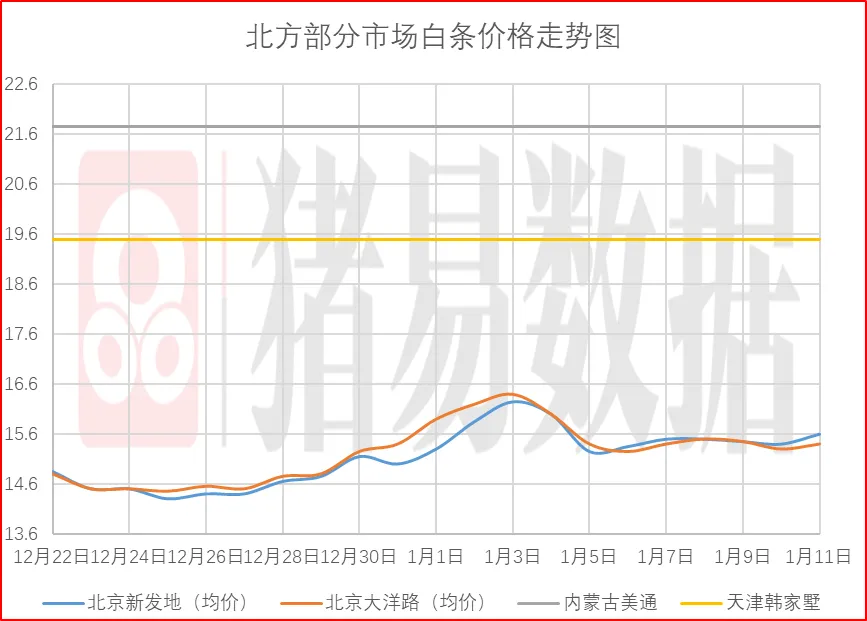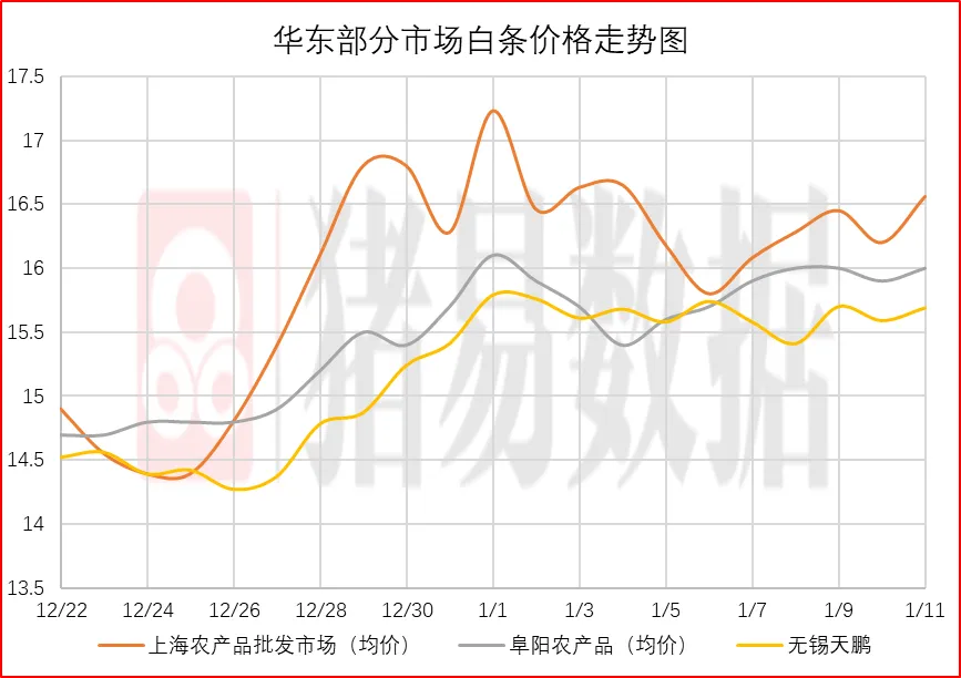 从今日北京、上海消费城市批发市场白条价格走势来看,北京、上海批发市场白条成交价格呈现稳中伴涨,北京市场开磅价呈现稳定为主,市场成交均价表现一般,市场走货速度表现一般;上海市场价格呈现上涨,部分市场成交价参考16.56-16.99元/公斤,到货量增加,市场交易情绪表现一般,市场成交均价表现一般。