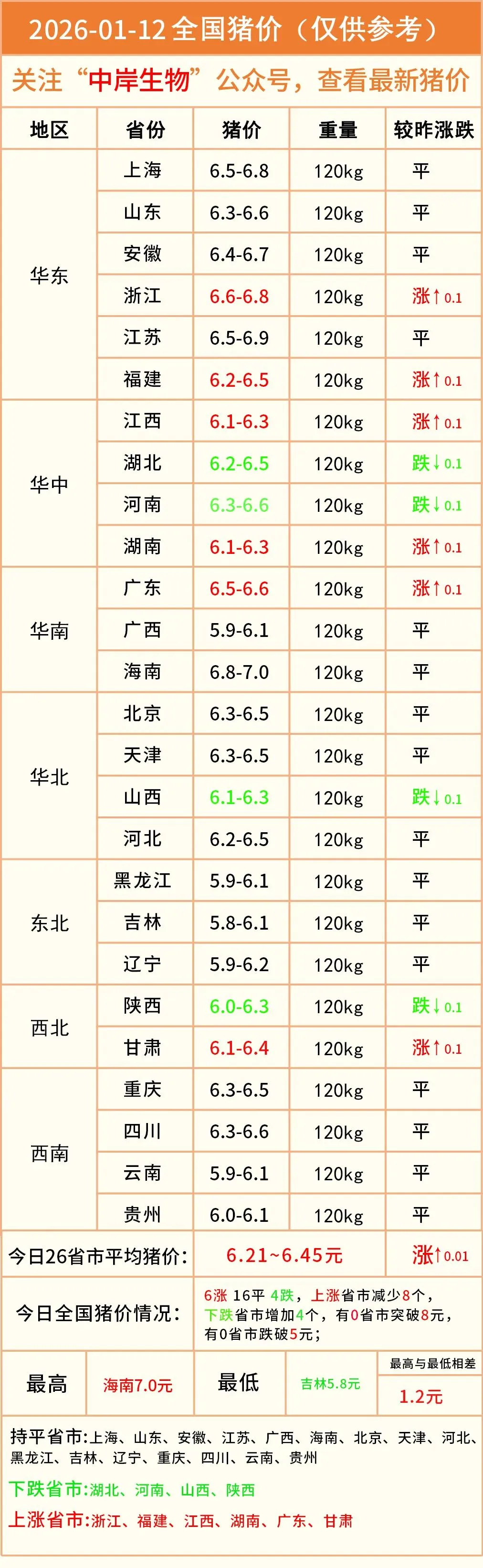 明日猪价|2026-01-12全国最新猪价(猪价已更新!) 养羊网 2026-01-11 明日猪价|2026-01-12全国最新猪价(猪价已更新!)营销中心丨0731-83806009技术服务丨0731-83806019 养羊网 2026-01-11 上一篇:猪价由涨转稳!明日预计行情:6涨17平4跌!附1月12日最新全国生 下一篇:1月11号 最新鸡蛋价格速查 您可能还会对下面的文章感兴趣111: 相关文章 小白第一次去菜市场买猪肉,这是好的吗? 没人比肉羊老师更懂侵权 回了趟家,发现我爸每天都在喝袋装定制牛奶 烟草价格大公开!这些烟你都抽过吗?