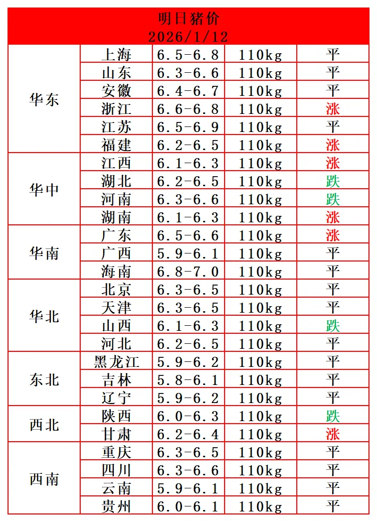 2026.1.12-今日最新猪价(步步高升,猪价继续往上涨!) 养羊网 2026-01-12 2026.1.12-今日最新猪价(步步高升,猪价继续往上涨!) 养羊网 2026-01-12 上一篇:猪市走势:猪价涨势延续,北方多地散户看涨情绪较强、惜售现象较多,对形成一定支撑! 下一篇:猪价反弹提振信心,1月存栏或双增 您可能还会对下面的文章感兴趣111: 相关文章 内蒙古养殖巨头,年销牛羊3000万 近期价格更新!!! 2026.1.7-明日猪价【匹格美特V6】性价比之王,三天看采食,七天看毛色 近期价格更新!!!