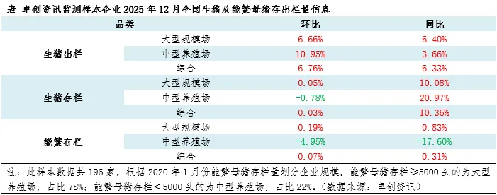 卓创资讯监测196家样本养殖企业生猪存出栏数据显示,12月能繁母猪存栏与生猪存栏均环比微增。能繁母猪存栏12月份由减转增,由11月减0.62%转为12月增0.07%;而生猪存栏依然延续增加趋势,但增幅收窄,幅度为0.03%。