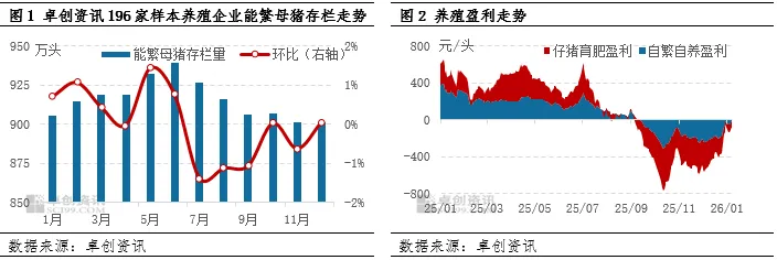 综上所述,当前生猪价格上行预期提振养殖端信心,仔猪补栏积极性提升,叠加出栏意愿低迷,养殖端产能调整以补栏扩量为核心方向。卓创资讯预计1月样本企业能繁母猪存栏或延续微增态势,生猪存栏亦或同步上行。这一存栏端的双增长格局,是养殖端对市场行情的积极反馈,也将为后续生猪市场供应格局的演变筑牢产能基础。