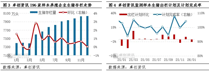 卓创资讯监测196家样本养殖企业12月生猪存栏量延续增量,但增幅收窄。12月行业仍处于产能释放周期,为生猪存栏量的增长奠定了基础。但据卓创资讯调研,12月北方市场猪病复发,且影响主要集中于商品猪存栏,成为制约生猪存栏增幅的重要因素之一。此外,卓创资讯对230家样本养殖企业的监测显示,12月出栏计划完成率达104.26%,实现超量出栏。究其原因,一是北方猪病复发后,部分养殖主体为降低疫病带来的损失,提前降重出栏;二是12月生猪价格整体较低,养殖端对后市行情信心偏弱,同样倾向于加快出栏节奏。综上,受北方猪病复发与养殖端提前出栏的双重影响,12月生猪存栏量虽延续增长,但实际增幅受到明显制约。