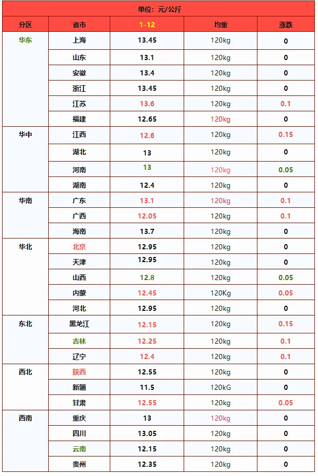 1、1月11日全国猪价整体企稳,东北保持上涨,据统计,11日屠宰企业散户主流收购120公斤-130公斤标准体重生猪平均价格为12.58元/公斤,较昨日价格上涨0.03元/公斤。9个省份猪价上涨,18个省份猪价企稳。