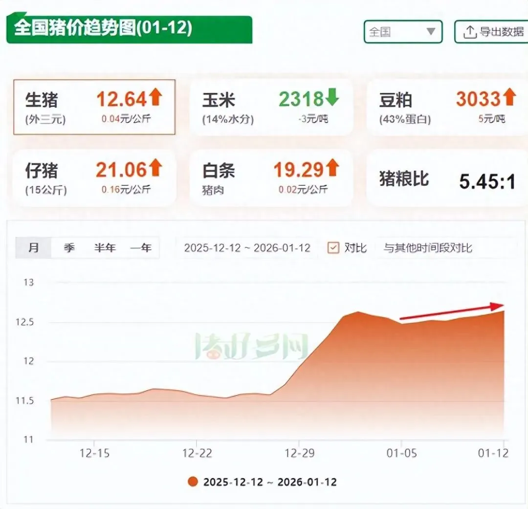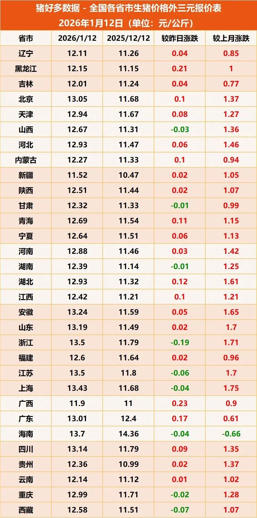 涨声一片!近期生猪市场持续回暖,全国22省猪价行情全线“飘红”!据猪好多数据监测显示,2026年1月12日全国外三元生猪均价为12.64元/公斤,较昨日上涨0.04元/公斤,1月至今猪价行情由月初低点12.47元/公斤一路反弹,累计涨幅1.36%。