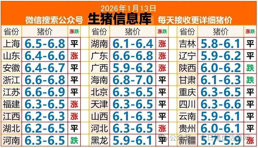 猪价26.01.13 养羊网 2026-01-12 猪价26.01.13 养羊网 2026-01-12 上一篇:猪价大预测】1月14~1月16日!全国猪价大 下一篇:2026.1.13 今日鸡蛋价格 您可能还会对下面的文章感兴趣111: 相关文章 ??真有鸡蛋香的鸡蛋仔 万物皆可出 2025年4月13日全国各地生猪价格信息 ?**5.7和朋友平潭已逃,两人崩溃了…