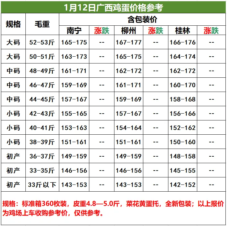 1月12日桂林、柳州、南宁鸡蛋价格参考,价格稳
