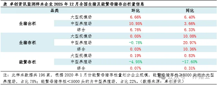 综上所述,当前生猪价格上行预期提振养殖端信心,仔猪补栏积极性提升,叠加出栏意愿低迷,养殖端产能调整以补栏扩量为核心方向。卓创资讯预计1月样本企业能繁母猪存栏或延续微增态势,生猪存栏亦或同步上行。这一存栏端的双增长格局,是养殖端对市场行情的积极反馈,也将为后续生猪市场供应格局的演变筑牢产能基础。