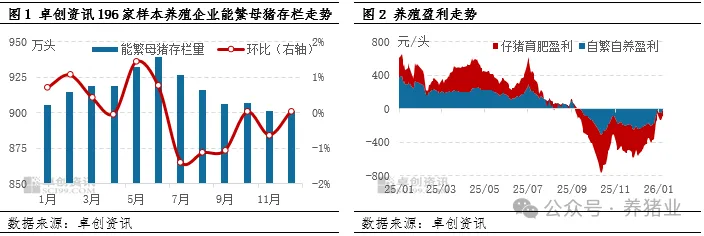 卓创资讯监测196家样本养殖企业12月能繁母猪存栏量环比微增。如图1所示,12月能繁母猪存栏量较11月变动幅度有限,这一走势源于两方面因素共同作用。一方面,养殖盈利亏损幅度显著收窄,叠加仔猪价格回暖,放缓了行业去产能节奏。截至12月底,自繁自养盈利为-15.69元/头,较月初亏损(-206.39元/头)减少190.71元/头;仔猪育肥盈利为-33.49元/头,较月初亏损(-290.94元/头)减少257.44元/头。盈利端压力缓解,加之12月中下旬仔猪价格止跌回升,样本养殖企业淘汰母猪的意愿减弱,能繁母猪存栏量的下降幅度因此受限。另一方面,市场预期向好推动部分企业启动补栏。部分养殖端对2026年下半年生猪市场行情持乐观判断,个别企业已开展补栏增养的产能修复操作。综上,养殖端去产能动作收敛,叠加部分企业的补栏扩产行为,且增幅大于降幅,共同推动全国能繁母猪存栏量实现环比微增。