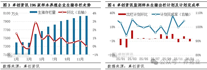卓创资讯监测196家样本养殖企业12月生猪存栏量延续增量,但增幅收窄。12月行业仍处于产能释放周期,为生猪存栏量的增长奠定了基础。但据卓创资讯调研,12月北方市场猪病复发,且影响主要集中于商品猪存栏,成为制约生猪存栏增幅的重要因素之一。此外,卓创资讯对230家样本养殖企业的监测显示,12月出栏计划完成率达104.26%,实现超量出栏。究其原因,一是北方猪病复发后,部分养殖主体为降低疫病带来的损失,提前降重出栏;二是12月生猪价格整体较低,养殖端对后市行情信心偏弱,同样倾向于加快出栏节奏。综上,受北方猪病复发与养殖端提前出栏的双重影响,12月生猪存栏量虽延续增长,但实际增幅受到明显制约。