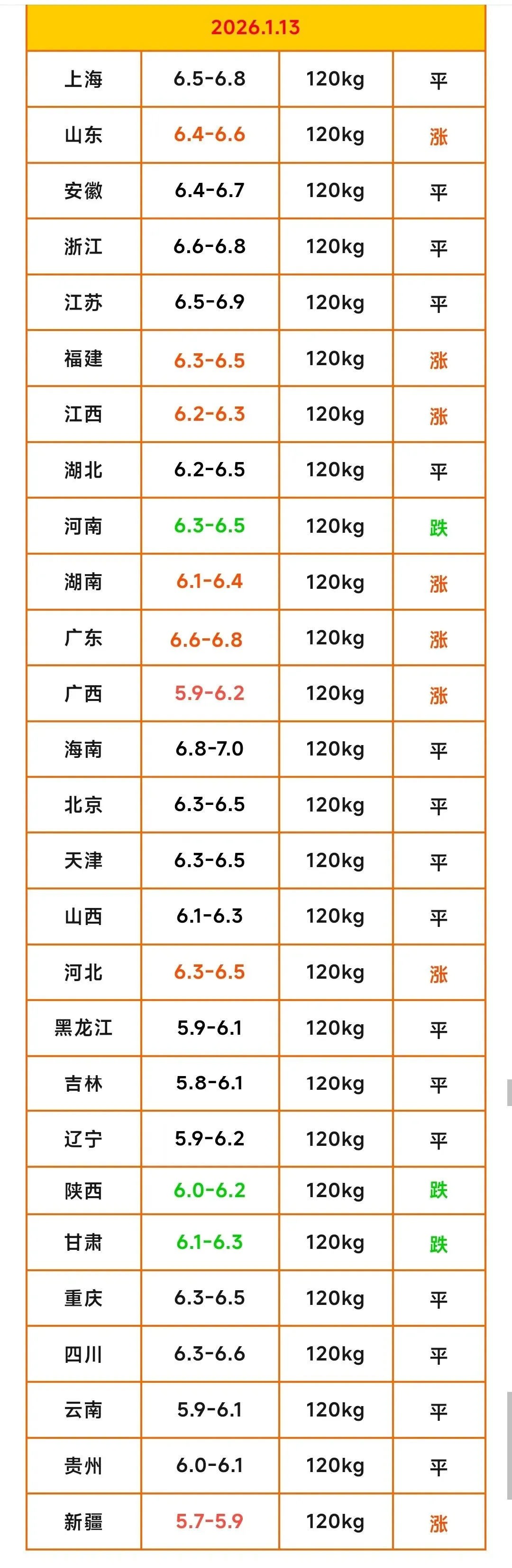 【明天猪价】1月13日最新猪价(涨跌调整)↑↑↑↑↑↑点击上方蓝字“养殖人家园”添加关注,每天给您最新、最准、最及时的猪价信息